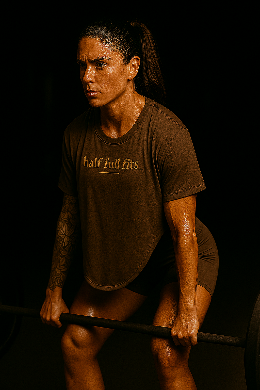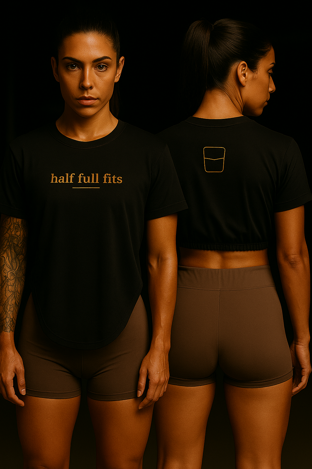 This isnβt your average pump cover. The Peachy Tee is designed with a subtle U-cut front and an exposed back hem β giving you the gym girl tuck without the fuss. Itβs oversized in the front for coverage and confidence, cropped in the back to show off your shape, and finished with our signature Half Full Fits logo.